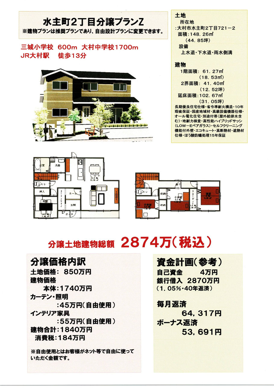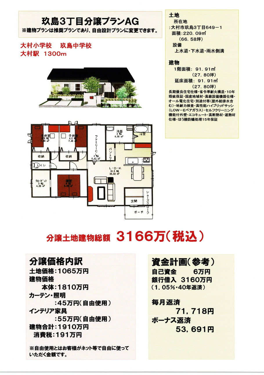 おすすめのの特選売地に楽暮houseの『暮らしが楽しくなる家』をセットした《土地+建物》の分譲建物として紹介しています。分譲価格には《土地+建物》の費用とインテリア家具、照明、カーテンも全て含めてのフル装備の仕様になっています。